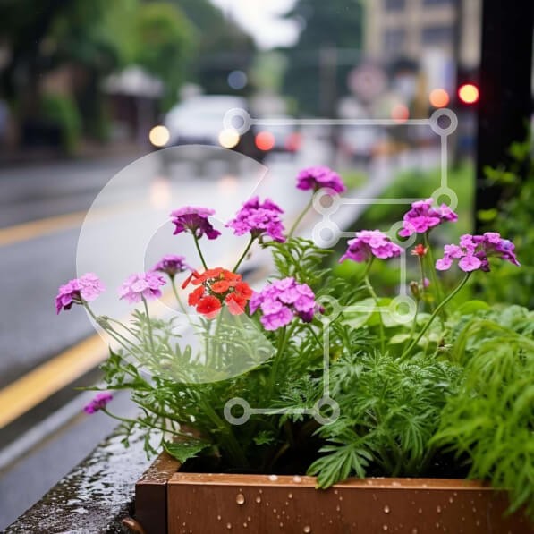 Υπάρχει δυνατότητα προσωποποίησης με δική σας φωτογραφία και προσαρμογής διαστάσεων κατόπιν παραγγελίας. Το συγεκεριμενο puzzle παρουσιαζει Η εικόνα δείχνει ένα κουτί λουλουδιών γεμάτο με μοβ λουλούδια στη βροχή, που περιβάλλεται από αυτοκίνητα που κινούνται στο δρόμο. Τα λουλούδια φαίνονται ζωντανά και πλούσια, πιθανώς λόγω του ποτίσματος κατά την πρόσφατη καταιγίδα. Μια ομπρέλα είναι επίσης ορατή στην άκρη του δ