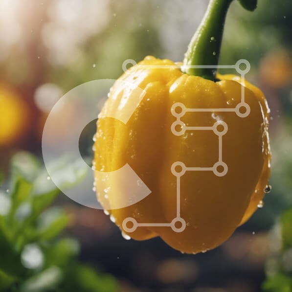 Υπάρχει δυνατότητα προσωποποίησης με δική σας φωτογραφία και προσαρμογής διαστάσεων κατόπιν παραγγελίας. Το συγεκεριμενο puzzle παρουσιαζει Αυτή η εικόνα παρουσιάζει μια ζωντανή κίτρινη πιπεριά που κρέμεται από ένα αμπέλι σε ένα θερμοκήπιο. Η πιπεριά έχει λεία και γυαλιστερή επιφάνεια, με ελαφριά καμπύλη στην κορυφή. Το αμπέλι καλύπτεται από σταγονίδια νερού που αντανακλούν το φως του ήλιου που περνά από τα παράθυ