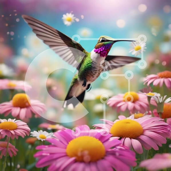 Υπάρχει δυνατότητα προσωποποίησης με δική σας φωτογραφία και προσαρμογής διαστάσεων κατόπιν παραγγελίας. Το συγεκεριμενο puzzle παρουσιαζει Η εικόνα δείχνει ένα πολύχρωμο κολίβριο να πετά πάνω από ροζ λουλούδια και μαργαρίτες, πιθανώς να τρέφεται με το νέκταρ. Τα ζωηρά χρώματα των λουλουδιών δημιουργούν ένα οπτικά ελκυστικό σκηνικό για το πουλί που αιωρείται. Μπορεί επίσης να υπάρχουν πεταλούδες και άλλα έντομα, π