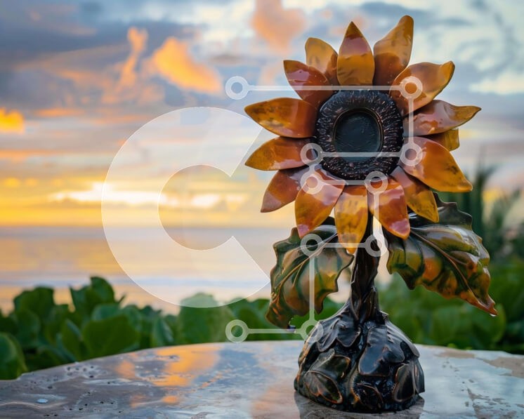 Υπάρχει δυνατότητα προσωποποίησης με δική σας φωτογραφία και προσαρμογής διαστάσεων κατόπιν παραγγελίας. Το συγεκεριμενο puzzle παρουσιαζει Η εικόνα παρουσιάζει ένα γλυπτό ηλίανθου σε ένα τραπέζι εξωτερικού χώρου με φόντο τον ωκεανό. Το κεραμικό άγαλμα είναι διακοσμημένο με πολύχρωμα λουλούδια και φύλλα, που εμφανίζονται διακοσμητικά και διακοσμητικά. Ένα μοναδικό puzzle που συνδυάζει ποιότητα, αισθητική και εμπε