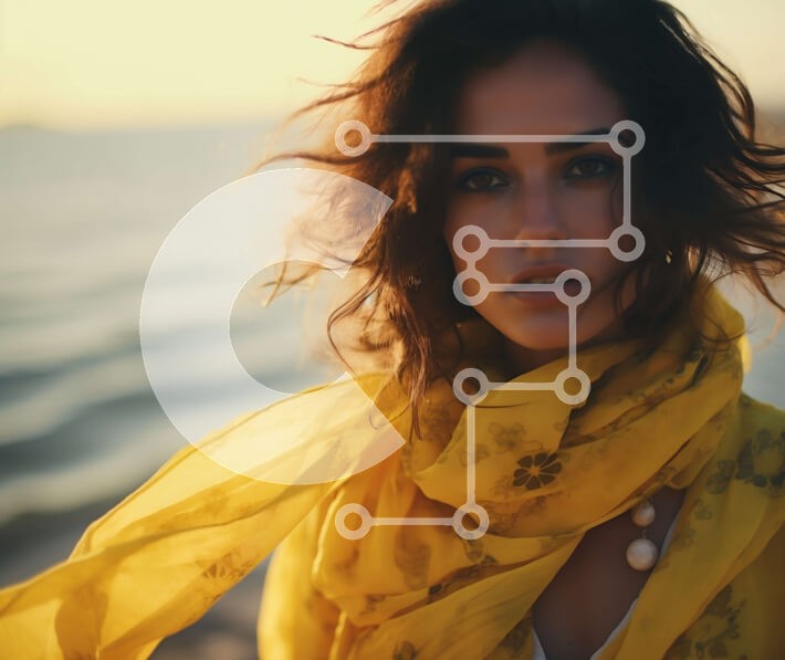 Υπάρχει δυνατότητα προσωποποίησης με δική σας φωτογραφία και προσαρμογής διαστάσεων κατόπιν παραγγελίας. Το συγεκεριμενο puzzle παρουσιαζει Αυτή η εικόνα παρουσιάζει μια γυναίκα που φορά ένα κίτρινο κασκόλ να στέκεται σε μια αμμώδη παραλία κατά τη διάρκεια του ηλιοβασιλέματος. Έχει μακριά, καστανά σγουρά μαλλιά και είναι ντυμένη με λευκό τοπ με μαργαριταρένιο κολιέ. Κοιτάζοντας μακριά, έχει μια στοχαστική έκφραση
