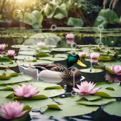 Υπάρχει δυνατότητα προσωποποίησης με δική σας φωτογραφία και προσαρμογής διαστάσεων κατόπιν παραγγελίας. Το συγεκεριμενο puzzle παρουσιαζει Αυτή η εικόνα παρουσιάζει μια πάπια που κολυμπά σε μια λίμνη με ροζ νούφαρα να την περιβάλλουν. Η πάπια φαίνεται να ακουμπάει στην επιφάνεια του νερού, υποδηλώνοντας πιθανώς ότι χαλαρώνει και απολαμβάνει το περιβάλλον της. Επιπλέον, υπάρχουν πολλά πράσινα φύλλα που περιβάλλουν