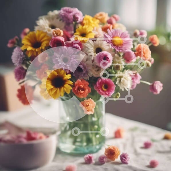 Υπάρχει δυνατότητα προσωποποίησης με δική σας φωτογραφία και προσαρμογής διαστάσεων κατόπιν παραγγελίας. Το συγεκεριμενο puzzle παρουσιαζει Αυτή η εικόνα παρουσιάζει μια όμορφη διάταξη από πολύχρωμα λουλούδια σε ένα γυάλινο βάζο τοποθετημένο σε ένα άδειο τραπέζι. Η ποικιλία των λουλουδιών περιλαμβάνει τριαντάφυλλα, γαρύφαλλα, μαργαρίτες και ηλίανθους. Υπάρχει επίσης ένα μπολ στο τραπέζι, το οποίο υποδηλώνει την πι