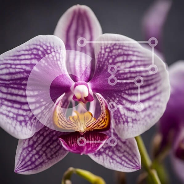 Υπάρχει δυνατότητα προσωποποίησης με δική σας φωτογραφία και προσαρμογής διαστάσεων κατόπιν παραγγελίας. Το συγεκεριμενο puzzle παρουσιαζει Αυτή η εικόνα είναι μια κοντινή όψη ενός μωβ και λευκού λουλουδιού ορχιδέας. Το λουλούδι είναι στο επίκεντρο και οι λεπτομέρειες των πετάλων και του κέντρου του είναι καθαρά ορατές. Το φόντο είναι σκούρο, γεγονός που βοηθά να τονιστούν τα χρώματα και η ομορφιά του λουλουδιού.