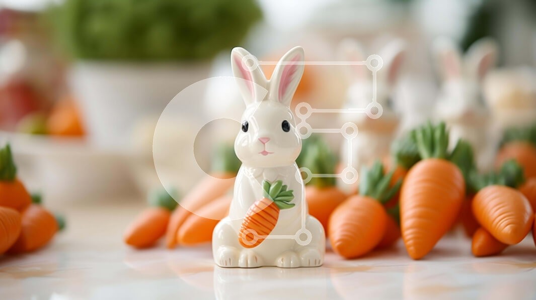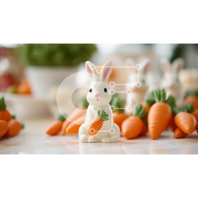 Υπάρχει δυνατότητα προσωποποίησης με δική σας φωτογραφία και προσαρμογής διαστάσεων κατόπιν παραγγελίας. Το συγεκεριμενο Puzzle 10x10 cm – 25 κομμ παρουσιαζει Η εικόνα δείχνει ένα λευκό ειδώλιο κουνελιού τοποθετημένο στο κέντρο πολλών διάσπαρτων καρότων σε ένα τραπέζι, παραπέμποντας σε μια γιορτή του Πάσχα. Γύρω από το κουνέλι υπάρχουν άλλα μικρά αντικείμενα όπως πιάτα και χαρτοπετσέτες. Ένα μονα