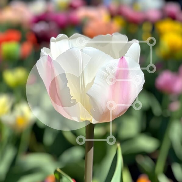 Υπάρχει δυνατότητα προσωποποίησης με δική σας φωτογραφία και προσαρμογής διαστάσεων κατόπιν παραγγελίας. Το συγεκεριμενο puzzle παρουσιαζει Η εικόνα δείχνει μια όμορφη τουλίπα με λευκά πέταλα με απαλό ροζ χρώμα, που ξεχωρίζει σε ένα ζωντανό φόντο γεμάτο με διάφορες χρωματιστές τουλίπες. Το φως του ήλιου φωτίζει τις λεπτές υφές των πετάλων, αναδεικνύοντας την κομψότητα και τη χάρη τους. Η σκηνή αποτυπώνει την ουσία