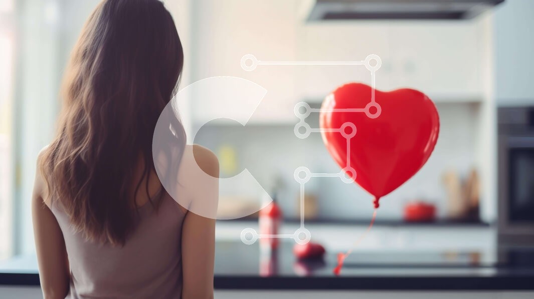 Υπάρχει δυνατότητα προσωποποίησης με δική σας φωτογραφία και προσαρμογής διαστάσεων κατόπιν παραγγελίας. Το συγεκεριμενο Puzzle 10x10 cm – 25 κομμ παρουσιαζει Η εικόνα απεικονίζει μια γυναίκα να στέκεται μπροστά από την κουζίνα και να κοιτάζει ένα κόκκινο μπαλόνι σε σχήμα καρδιάς που επιπλέει στον αέρα. Ένα μπουκάλι κρασί στον πάγκο προτείνει μια γιορτή της Ημέρας του Αγίου Βαλεντίνου με την οικογ