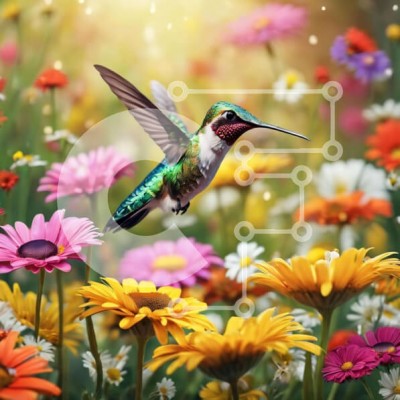 Υπάρχει δυνατότητα προσωποποίησης με δική σας φωτογραφία και προσαρμογής διαστάσεων κατόπιν παραγγελίας. Το συγεκεριμενο puzzle παρουσιαζει Η εικόνα δείχνει ένα ζωντανό κολιμπρί να πετά ανάμεσα σε μια ποικιλία από λουλούδια. Το πουλί συλλαμβάνεται κατά τη διάρκεια της πτήσης, με τα φτερά του τεντωμένα, έτοιμο να απογειωθεί. Το ανθοπωλείο στολίζεται με διάφορα είδη μαργαριτών, όπως ηλίανθους, νάρκισσους, ζίννιες.