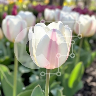 Υπάρχει δυνατότητα προσωποποίησης με δική σας φωτογραφία και προσαρμογής διαστάσεων κατόπιν παραγγελίας. Το συγεκεριμενο puzzle παρουσιαζει Αυτή η εικόνα παρουσιάζει μια κοντινή άποψη μιας λευκής τουλίπας με λεπτές ροζ ραβδώσεις. Η τουλίπα ξεχωρίζει σε περίοπτη θέση στο προσκήνιο, που περιβάλλεται από ένα ζωντανό πεδίο τουλίπες σε διάφορα χρώματα, δημιουργώντας ένα απαλό, ονειρικό φόντο. Το φως του ήλιου φωτίζει τ