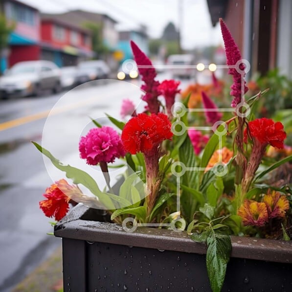 Υπάρχει δυνατότητα προσωποποίησης με δική σας φωτογραφία και προσαρμογής διαστάσεων κατόπιν παραγγελίας. Το συγεκεριμενο puzzle παρουσιαζει Η εικόνα δείχνει μια μαύρη ζαρντινιέρα γεμάτη με ζωντανά λουλούδια κάτω από τη βροχή. Γύρω από τη ζαρντινιέρα υπάρχουν σταθμευμένα αυτοκίνητα, υποδηλώνοντας μεγάλη κίνηση στην περιοχή. Πολλαπλές γλάστρες πλαισιώνουν το δρόμο, υπονοώντας τη συνεχή φροντίδα για τα λουλούδια. Έν