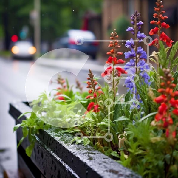 Υπάρχει δυνατότητα προσωποποίησης με δική σας φωτογραφία και προσαρμογής διαστάσεων κατόπιν παραγγελίας. Το συγεκεριμενο puzzle παρουσιαζει Η εικόνα παρουσιάζει μια μαύρη ζαρντινιέρα γεμάτη με πολύχρωμα λουλούδια στη βροχή. Υπάρχουν αρκετοί διαφορετικοί τύποι λουλουδιών, όπως κόκκινο, μωβ, μπλε και κίτρινο, που μπορεί να δει κανείς στην άκρη του δρόμου. Ένα αυτοκίνητο οδηγεί στο δρόμο κοντά στο παρτέρι, υποδηλώνον