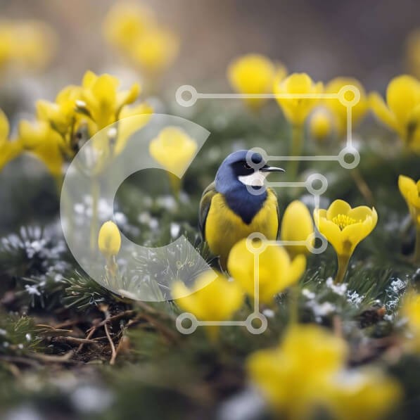 Υπάρχει δυνατότητα προσωποποίησης με δική σας φωτογραφία και προσαρμογής διαστάσεων κατόπιν παραγγελίας. Το συγεκεριμενο puzzle παρουσιαζει Η εικόνα δείχνει ένα γαλανόλευκο πουλί που στέκεται στη μέση κίτρινων νάρκισσους. Το πουλί φαίνεται να είναι σκαρφαλωμένο πάνω από τα λουλούδια, τα οποία είναι διάσπαρτα σε όλη τη χορταριασμένη περιοχή. Είναι πιθανό ότι το πουλί ψάχνει για τροφή ή καταφύγιο από τον κρύο καιρό.