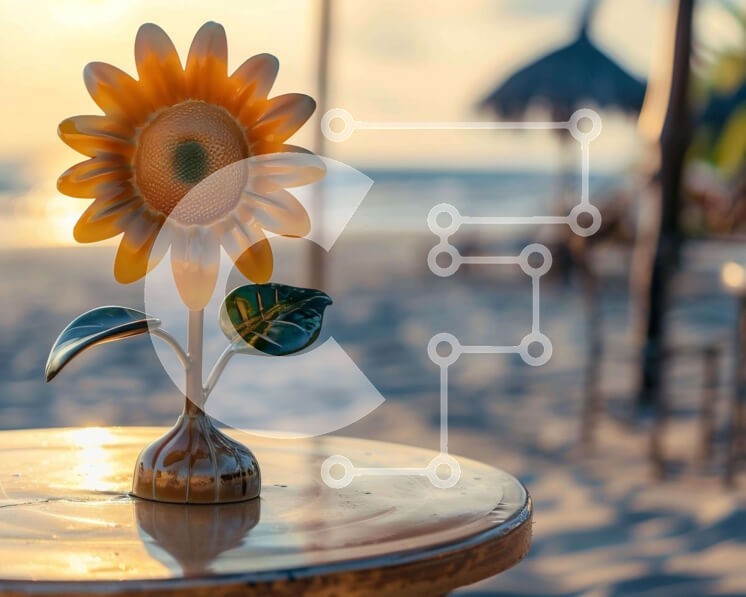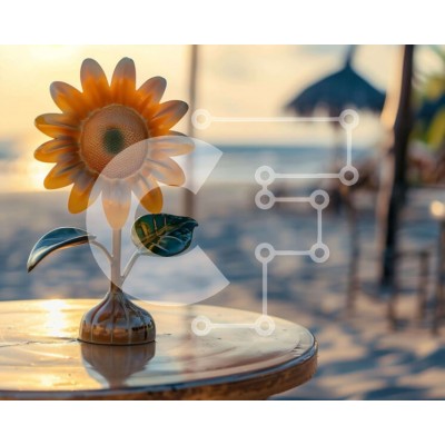 Υπάρχει δυνατότητα προσωποποίησης με δική σας φωτογραφία και προσαρμογής διαστάσεων κατόπιν παραγγελίας. Το συγεκεριμενο puzzle παρουσιαζει Η εικόνα παρουσιάζει ένα κίτρινο βάζο με λουλούδια που κάθεται πάνω από ένα υπαίθριο τραπέζι στην παραλία. Το τραπέζι είναι τοποθετημένο μπροστά στον ήλιο, ο οποίος φαίνεται από πολλές γωνίες στην εικόνα. Υπάρχουν πολλές καρέκλες και τραπέζια γύρω από το τραπέζι, γεγονός που υ