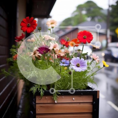Υπάρχει δυνατότητα προσωποποίησης με δική σας φωτογραφία και προσαρμογής διαστάσεων κατόπιν παραγγελίας. Το συγεκεριμενο puzzle παρουσιαζει Ένα ξύλινο κουτί γεμάτο με πολύχρωμα λουλούδια στη βροχή, με διάφορες αποχρώσεις του κόκκινου, του κίτρινου, του μπλε και του λευκού άνθη. Ένα αυτοκίνητο είναι σταθμευμένο στην άκρη του δρόμου, υποδεικνύοντας μια βροχερή μέρα. Ένα μοναδικό puzzle που συνδυάζει ποιότητα, αισθη