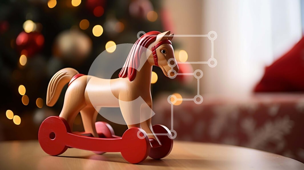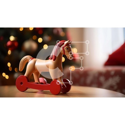 Υπάρχει δυνατότητα προσωποποίησης με δική σας φωτογραφία και προσαρμογής διαστάσεων κατόπιν παραγγελίας. Το συγεκεριμενο Puzzle 10x10 cm – 25 κομμ παρουσιαζει Αυτή η εικόνα δείχνει ένα ξύλινο άλογο παιχνίδι τοποθετημένο σε ένα τραπέζι μπροστά από ένα διακοσμητικό χριστουγεννιάτικο δέντρο. Το δωμάτιο είναι στολισμένο με κόκκινα και πράσινα φώτα, δημιουργώντας μια γιορτινή ατμόσφαιρα. Είναι μια τέλε