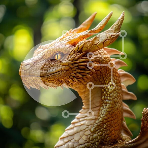 Υπάρχει δυνατότητα προσωποποίησης με δική σας φωτογραφία και προσαρμογής διαστάσεων κατόπιν παραγγελίας. Το συγεκεριμενο puzzle παρουσιαζει Αυτή η εικόνα παρουσιάζει ένα εξαιρετικά λεπτομερές γλυπτό δράκου σε ένα θολό πράσινο φόντο. Ο δράκος απεικονίζεται σε ένα πλάγιο προφίλ με περίπλοκα λέπια και χρυσές αποχρώσεις, που αναδεικνύει την άγρια έκφρασή του και το εντυπωσιακό κεχριμπαρένιο μάτι του. Το φόντο είναι