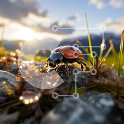 Υπάρχει δυνατότητα προσωποποίησης με δική σας φωτογραφία και προσαρμογής διαστάσεων κατόπιν παραγγελίας. Το συγεκεριμενο puzzle παρουσιαζει Αυτή η εικόνα παρουσιάζει μια κοντινή άποψη μιας πασχαλίτσας που σέρνεται στο πράσινο γρασίδι σε ένα λιβάδι. Στο βάθος, υπάρχουν εκπληκτικά βουνά λουσμένα στις ζεστές αποχρώσεις ενός ηλιοβασιλέματος. Η σκηνή αποπνέει ηρεμία και την ομορφιά της φύσης το σούρουπο. Ένα μοναδικό