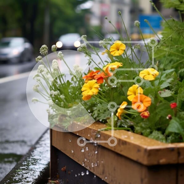 Υπάρχει δυνατότητα προσωποποίησης με δική σας φωτογραφία και προσαρμογής διαστάσεων κατόπιν παραγγελίας. Το συγεκεριμενο puzzle παρουσιαζει Η εικόνα δείχνει ένα ξύλινο κουτί λουλουδιών γεμάτο με ζωηρά κίτρινα και πορτοκαλί λουλούδια, με φόντο τη βροχή. Δίπλα στο κουτί των λουλουδιών υπάρχουν πολλά αυτοκίνητα παρκαρισμένα στην άκρη του δρόμου, υποδηλώνοντας μια τοποθεσία φιλική προς τους μετακινούμενους. Η σκηνή πε