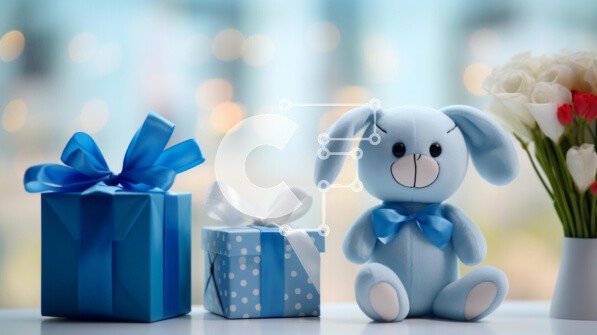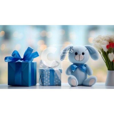 Υπάρχει δυνατότητα προσωποποίησης με δική σας φωτογραφία και προσαρμογής διαστάσεων κατόπιν παραγγελίας. Το συγεκεριμενο Puzzle 10x10 cm – 25 κομμ παρουσιαζει Αυτή η εικόνα παρουσιάζει ένα μπλε λαγουδάκι λούτρινο ζώο που κάθεται δίπλα σε δύο κουτιά δώρων, τα οποία είναι τυλιγμένα σε μπλε κορδέλες. Ένα βάζο με λουλούδια υπάρχει επίσης στο τραπέζι, προσθέτοντας επιπλέον οπτικό ενδιαφέρον στη σκηνή.