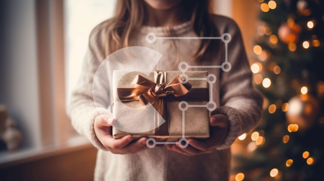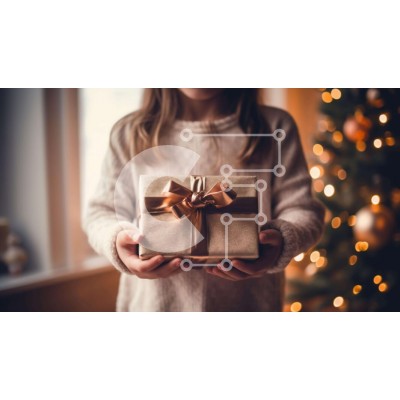 Υπάρχει δυνατότητα προσωποποίησης με δική σας φωτογραφία και προσαρμογής διαστάσεων κατόπιν παραγγελίας. Το συγεκεριμενο Puzzle 10x10 cm – 25 κομμ παρουσιαζει Αυτή η εικόνα παρουσιάζει ένα νεαρό κορίτσι που κρατά ένα ανοιχτό κουτί δώρου μπροστά από ένα χριστουγεννιάτικο δέντρο. Το παρόν είναι τυλιγμένο σε καφέ χαρτί και στολισμένο με κορδέλες ή φιόγκους. Το δέντρο είναι στολισμένο με φωτάκια, δημι