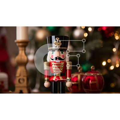 Υπάρχει δυνατότητα προσωποποίησης με δική σας φωτογραφία και προσαρμογής διαστάσεων κατόπιν παραγγελίας. Το συγεκεριμενο Puzzle 10x10 cm – 25 κομμ παρουσιαζει Αυτή η εικόνα παρουσιάζει ένα ειδώλιο καρυοθραύστη τοποθετημένο πάνω από ένα διακοσμημένο τραπέζι. Το τραπέζι είναι στολισμένο με κόκκινα και λευκά διακοσμητικά, δημιουργώντας μια γιορτινή ατμόσφαιρα. Γύρω από τη φιγούρα υπάρχουν χριστουγενν