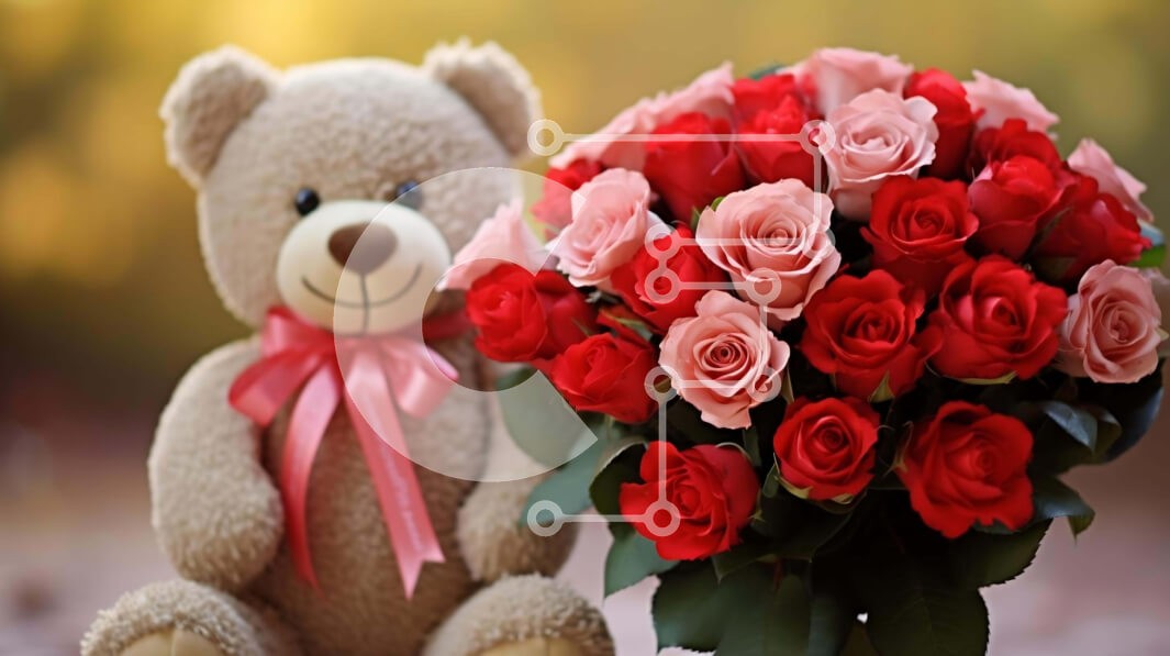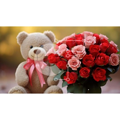 Υπάρχει δυνατότητα προσωποποίησης με δική σας φωτογραφία και προσαρμογής διαστάσεων κατόπιν παραγγελίας. Το συγεκεριμενο Puzzle 10x10 cm – 25 κομμ παρουσιαζει Αυτή η εικόνα παρουσιάζει ένα αρκουδάκι που κάθεται δίπλα σε μια όμορφη διάταξη από κόκκινα και ροζ τριαντάφυλλα. Η ανθοδέσμη είναι τοποθετημένη μπροστά στο πρόσωπο της αρκούδας, δημιουργώντας μια ρομαντική και στοργική ατμόσφαιρα. Ένα μονα