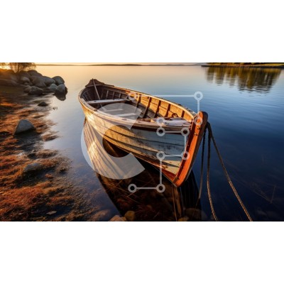 Υπάρχει δυνατότητα προσωποποίησης με δική σας φωτογραφία και προσαρμογής διαστάσεων κατόπιν παραγγελίας. Το συγεκεριμενο puzzle παρουσιαζει Αυτή η εικόνα παρουσιάζει ένα παλιό ξύλινο σκάφος αγκυροβολημένο στην όχθη μιας ήρεμης λίμνης κατά τη διάρκεια του ηλιοβασιλέματος. Το σκάφος έχει καφέ γάστρα και ξεθωριασμένα λευκά πανιά. Το νερό είναι βαθύ μπλε και ο ουρανός είναι ροζ και πορτοκαλί από τον ήλιο που δύει. Δεν