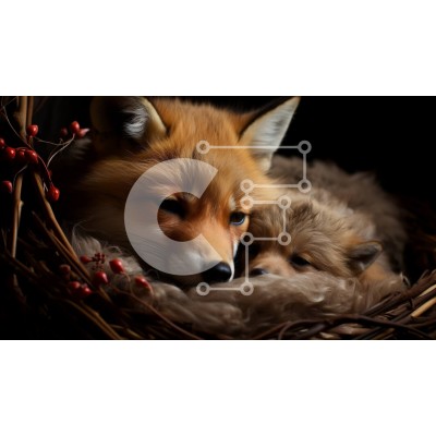 Υπάρχει δυνατότητα προσωποποίησης με δική σας φωτογραφία και προσαρμογής διαστάσεων κατόπιν παραγγελίας. Το συγεκεριμενο puzzle παρουσιαζει Αυτή η εικόνα δείχνει μια μαμά κόκκινη αλεπού κουλουριασμένη σε μια φωλιά, κρατώντας το μωρό της αλεπού κοντά στο στήθος της. Το μωρό αλεπού θηλάζει από τη μητέρα και η φωλιά είναι φτιαγμένη από κλαδιά και φύλλα. Στο βάθος, ένα σκοτεινό τοπίο δημιουργεί την ατμόσφαιρα, με κόκκ