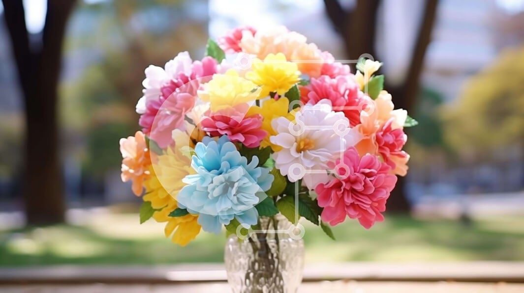Υπάρχει δυνατότητα προσωποποίησης με δική σας φωτογραφία και προσαρμογής διαστάσεων κατόπιν παραγγελίας. Το συγεκεριμενο puzzle παρουσιαζει Η εικόνα δείχνει ένα γυάλινο βάζο γεμάτο με μια ποικιλία από πολύχρωμα τεχνητά λουλούδια σε ένα υπαίθριο τραπέζι σε ένα πάρκο. Τα λουλούδια, κατασκευασμένα από χαρτί ή άλλα υλικά, περιλαμβάνουν αποχρώσεις κόκκινου, κίτρινου, μπλε, πράσινου και μοβ, δημιουργώντας μια ζωντανή κα