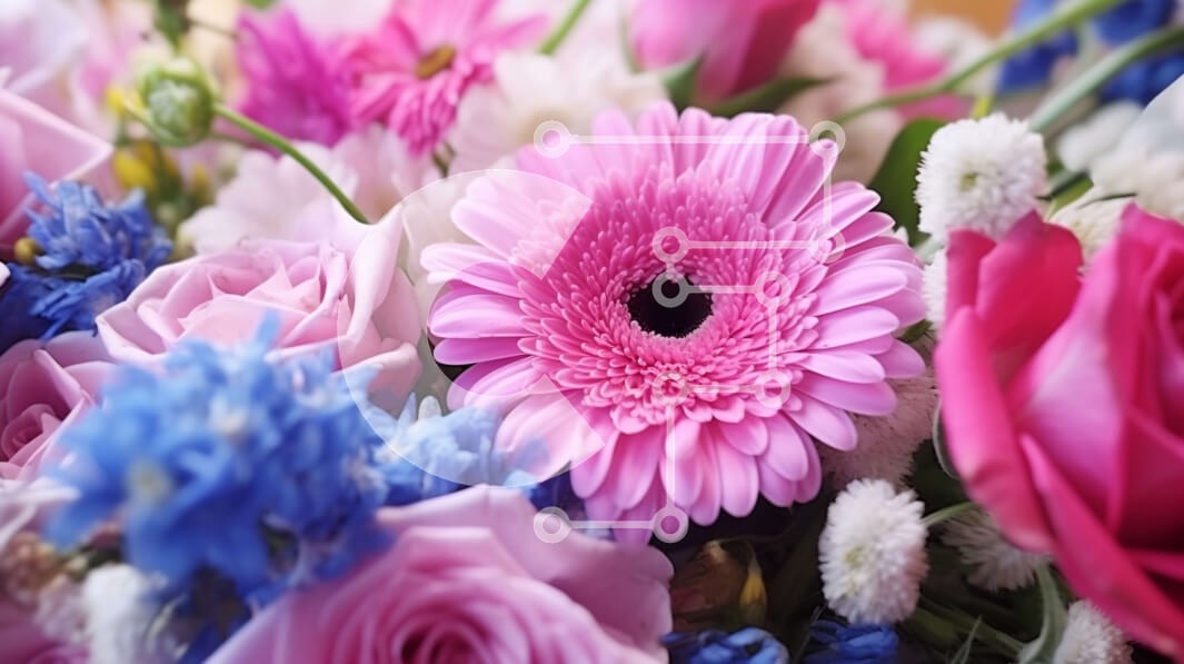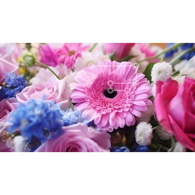 Υπάρχει δυνατότητα προσωποποίησης με δική σας φωτογραφία και προσαρμογής διαστάσεων κατόπιν παραγγελίας. Το συγεκεριμενο puzzle παρουσιαζει Αυτή η εικόνα δείχνει μια κοντινή άποψη ενός μπουκέτου λουλουδιών. Το μπουκέτο αποτελείται από ροζ, μπλε και λευκά λουλούδια, με τα ροζ λουλούδια να είναι πιθανότατα τριαντάφυλλα και τα μπλε και λευκά λουλούδια πιθανότατα γαρίφαλα. Τα λουλούδια είναι διατεταγμένα σε χαλαρό, πε