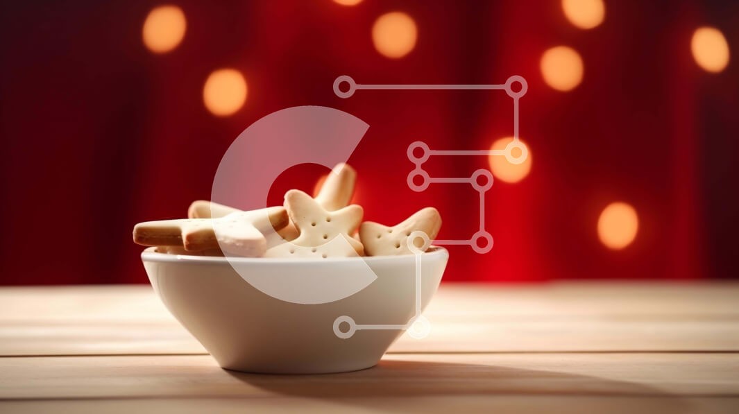 Υπάρχει δυνατότητα προσωποποίησης με δική σας φωτογραφία και προσαρμογής διαστάσεων κατόπιν παραγγελίας. Το συγεκεριμενο Puzzle 10x10 cm – 25 κομμ παρουσιαζει Αυτή η εικόνα παρουσιάζει ένα λευκό μπολ γεμάτο με μπισκότα σε σχήμα αστεριού και κουνελιού, τοποθετημένο πάνω από ένα διακοσμημένο ξύλινο τραπέζι. Το φόντο είναι διακοσμημένο με κόκκινα και πράσινα φώτα, δημιουργώντας μια γιορτινή ατμόσφαιρ
