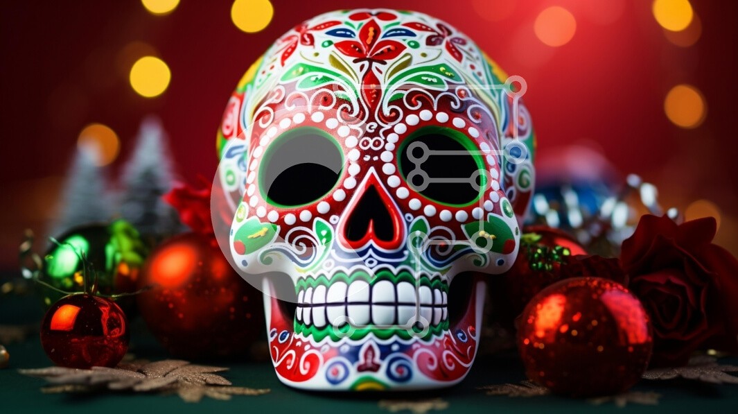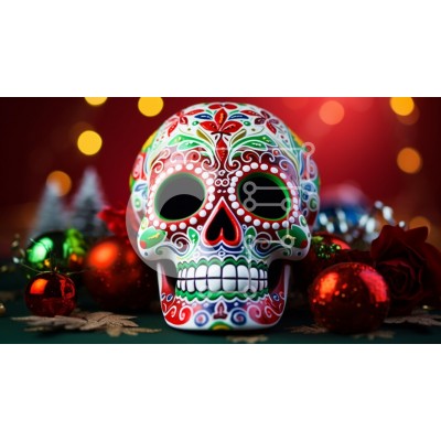 Υπάρχει δυνατότητα προσωποποίησης με δική σας φωτογραφία και προσαρμογής διαστάσεων κατόπιν παραγγελίας. Το συγεκεριμενο Puzzle 10x10 cm – 25 κομμ παρουσιαζει Η εικόνα παρουσιάζει ένα ζωηρά διακοσμημένο ζαχαροκεφαλάκι, διακοσμημένο με πολύχρωμα μοτίβα και λουλουδάτα σχέδια, με φόντο απαλά φώτα bokeh και εορταστικά στολίδια. Το κρανίο περιβάλλεται από λαμπερά κόκκινα και πράσινα χριστουγεννιάτικα μ