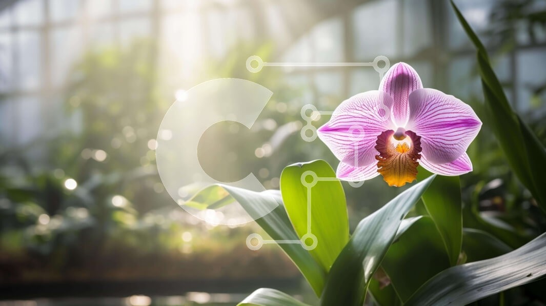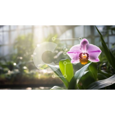 Υπάρχει δυνατότητα προσωποποίησης με δική σας φωτογραφία και προσαρμογής διαστάσεων κατόπιν παραγγελίας. Το συγεκεριμενο puzzle παρουσιαζει Η εικόνα δείχνει ένα ροζ λουλούδι ορχιδέας ανάμεσα σε καταπράσινα φυτά, υποδεικνύοντας ότι είναι μέρος ενός εσωτερικού κήπου ή θερμοκηπίου. Το φως του ήλιου που περνά μέσα από τα γυάλινα παράθυρα τονίζει την ομορφιά της σκηνής. Αρκετά γύρω φύλλα υπαινίσσονται μια πρόσφατη μετα