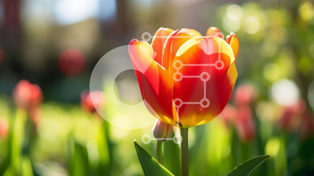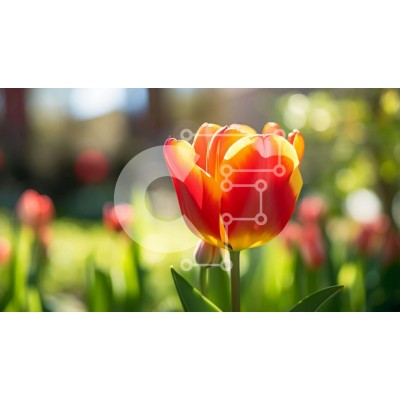 Υπάρχει δυνατότητα προσωποποίησης με δική σας φωτογραφία και προσαρμογής διαστάσεων κατόπιν παραγγελίας. Το συγεκεριμενο puzzle παρουσιαζει Η εικόνα παρουσιάζει μια πορτοκαλί τουλίπα στη μέση ενός χωραφιού με κόκκινα και κίτρινα λουλούδια. Φαίνεται να ανθίζει, πιθανότατα λόγω του λαμπερού ηλιακού φωτός που λάμπει πάνω του. Πολλά πράσινα φύλλα περιβάλλουν το λουλούδι, υποδηλώνοντας πρόσφατο πότισμα ή λίπανση. Ένα
