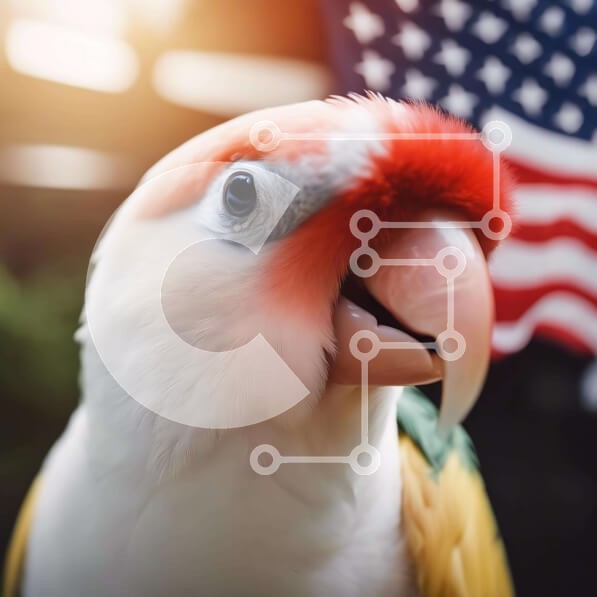 Υπάρχει δυνατότητα προσωποποίησης με δική σας φωτογραφία και προσαρμογής διαστάσεων κατόπιν παραγγελίας. Το συγεκεριμενο Puzzle 10x10 cm – 25 κομμ παρουσιαζει Η εικόνα δείχνει έναν λευκό και κόκκινο παπαγάλο να στέκεται μπροστά από μια αμερικανική σημαία. Το κεφάλι του πουλιού γέρνει ελαφρά στο πλάι, υποδηλώνοντας ότι είναι στραμμένο μακριά από την κάμερα. Φαίνεται επίσης να κοιτάζει απευθείας τον