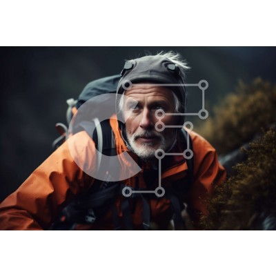 Υπάρχει δυνατότητα προσωποποίησης με δική σας φωτογραφία και προσαρμογής διαστάσεων κατόπιν παραγγελίας. Το συγεκεριμενο puzzle παρουσιαζει Αυτή η εικόνα απεικονίζει έναν ηλικιωμένο άνδρα να στέκεται σε έναν βραχώδη βράχο με θέα σε μια κοιλάδα, που περιβάλλεται από βουνά. Φοράει πορτοκαλί μπουφάν και μαύρο κράνος, με σακίδιο και μπαστούνια πεζοπορίας. Ο συννεφιασμένος ουρανός προσθέτει στη δραματική ατμόσφαιρα της
