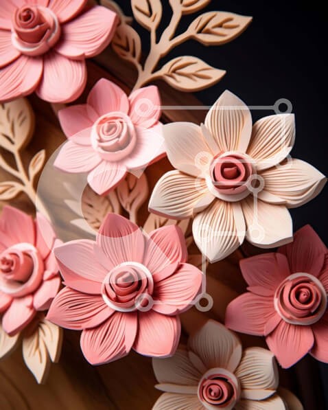 Υπάρχει δυνατότητα προσωποποίησης με δική σας φωτογραφία και προσαρμογής διαστάσεων κατόπιν παραγγελίας. Το συγεκεριμενο puzzle παρουσιαζει Η εικόνα παρουσιάζει μια διάταξη από ροζ και λευκά λουλούδια κατασκευασμένα από πηλό, χαρτί ή πλαστικό σε μια ξύλινη επιφάνεια. Τα άνθη είναι τοποθετημένα δημιουργικά για να δώσουν την εμφάνιση πολλαπλών ανθέων, που συμπληρώνονται από τα γύρω φύλλα. Η σύνθεση υποδηλώνει μια χε