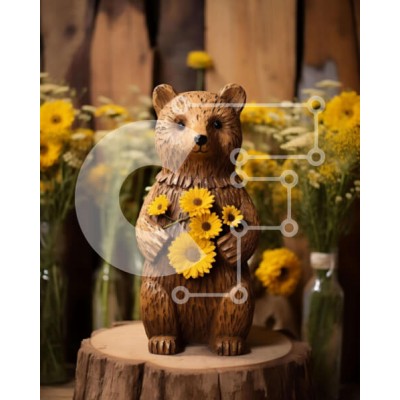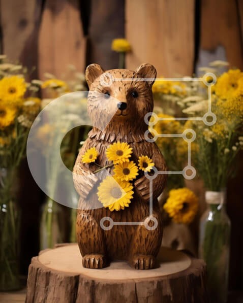 Υπάρχει δυνατότητα προσωποποίησης με δική σας φωτογραφία και προσαρμογής διαστάσεων κατόπιν παραγγελίας. Το συγεκεριμενο puzzle παρουσιαζει Η εικόνα παρουσιάζει ένα ξύλινο άγαλμα αρκούδας με κίτρινα λουλούδια στο στόμα της, τοποθετημένο στην κορυφή ενός παλιού κούτσουρου δέντρου. Σε κοντινή απόσταση, υπάρχουν πολλά αγγεία που θα μπορούσαν να χρησιμοποιηθούν για τη συγκράτηση νερού ή άλλων υγρών. Ένα μοναδικό puzz