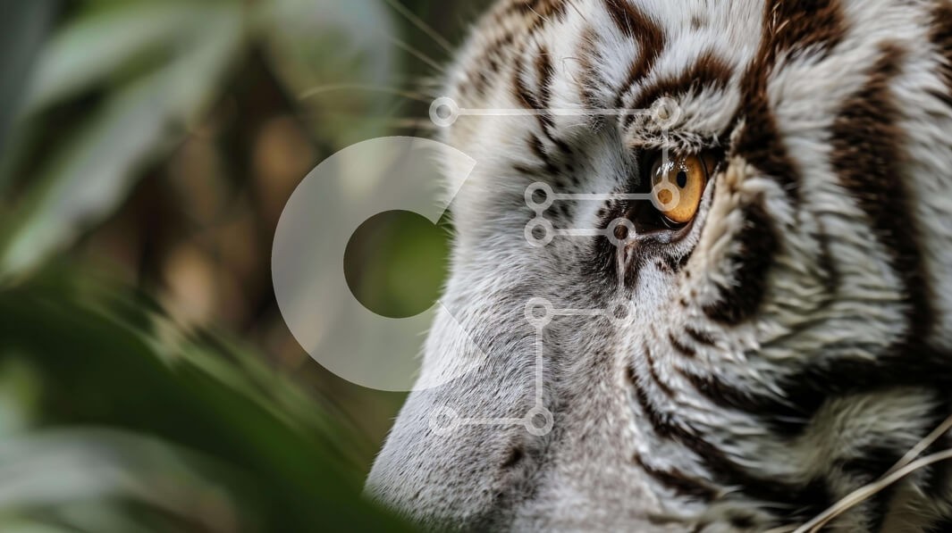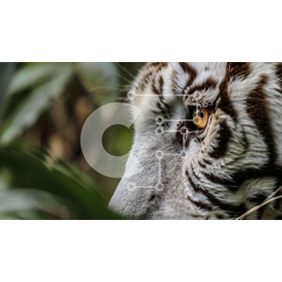 Υπάρχει δυνατότητα προσωποποίησης με δική σας φωτογραφία και προσαρμογής διαστάσεων κατόπιν παραγγελίας. Το συγεκεριμενο Puzzle 10x10 cm – 25 κομμ παρουσιαζει Αυτή η κοντινή εικόνα δείχνει το πρόσωπο μιας ενήλικης λευκής τίγρης, η οποία είναι εν μέρει κρυμμένη πίσω από το πράσινο φύλλωμα. Τα μάτια της τίγρης είναι ορθάνοιχτα, υποδηλώνοντας περιέργεια ή παιχνιδιάρικο. Η εικόνα παρέχει μια μοναδική