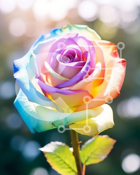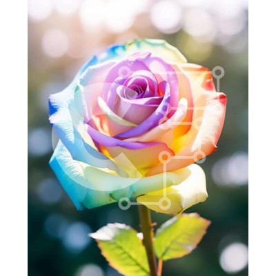 Υπάρχει δυνατότητα προσωποποίησης με δική σας φωτογραφία και προσαρμογής διαστάσεων κατόπιν παραγγελίας. Το συγεκεριμενο puzzle παρουσιαζει Η εικόνα παρουσιάζει ένα ενιαίο τριαντάφυλλο στο χρώμα του ουράνιου τόξου στο πρώτο πλάνο, με πράσινα φύλλα να το περιβάλλουν. Φαίνεται να αναπτύσσεται έξω από το έδαφος, κάτι που μπορεί να υποδηλώνει ότι ανθίζει ή ότι φυτεύτηκε πρόσφατα. Υπάρχει επίσης κάποιο θολό φόντο γύρω