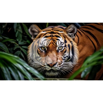 Υπάρχει δυνατότητα προσωποποίησης με δική σας φωτογραφία και προσαρμογής διαστάσεων κατόπιν παραγγελίας. Το συγεκεριμενο Puzzle 10x10 cm – 25 κομμ παρουσιαζει Αυτή η εικόνα παρουσιάζει ένα κοντινό πλάνο μιας τίγρης στη ζούγκλα. Η τίγρη κοιτάζει κατευθείαν την κάμερα με μια άγρια έκφραση και η καφέ γούνα και οι ορατές ρίγες της τονίζονται από το πράσινο φύλλωμα που την περιβάλλει. Η καλοσυνθέτη ε