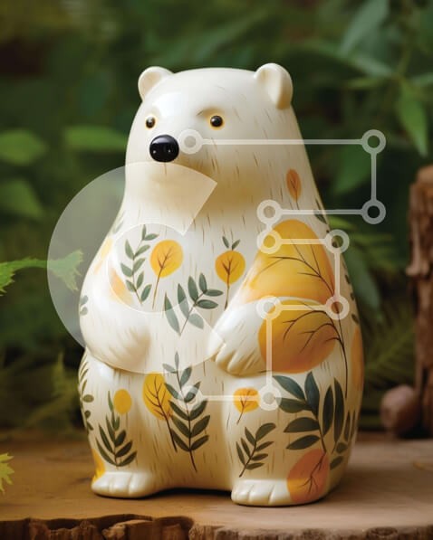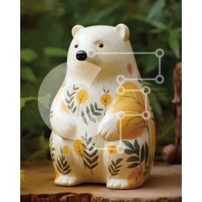 Υπάρχει δυνατότητα προσωποποίησης με δική σας φωτογραφία και προσαρμογής διαστάσεων κατόπιν παραγγελίας. Το συγεκεριμενο puzzle παρουσιαζει Αυτή η εικόνα παρουσιάζει ένα λευκό και κίτρινο ειδώλιο αρκούδας που κάθεται πάνω από ένα άγνωστο κούτσουρο δέντρου. Το ειδώλιο της αρκούδας είναι διακοσμημένο με φύλλα και λουλούδια, δίνοντάς του μια εμφάνιση εμπνευσμένη από τη φύση. Δεν υπάρχουν άλλα αντικείμενα στην εικόνα,