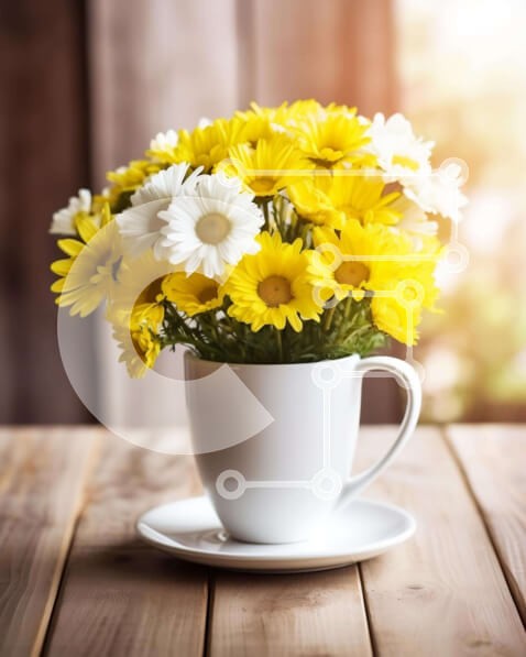 Υπάρχει δυνατότητα προσωποποίησης με δική σας φωτογραφία και προσαρμογής διαστάσεων κατόπιν παραγγελίας. Το συγεκεριμενο puzzle παρουσιαζει Η εικόνα δείχνει ένα λευκό φλιτζάνι καφέ γεμάτο με κίτρινες και λευκές μαργαρίτες, τοποθετημένο σε ένα παλιό ξύλινο τραπέζι. Τα λουλούδια αποπνέουν φρεσκάδα και ζωντάνια, καθιστώντας τα ιδανικά για διακόσμηση ή δώρο. Ένα μοναδικό puzzle που συνδυάζει ποιότητα, αισθητική και ε