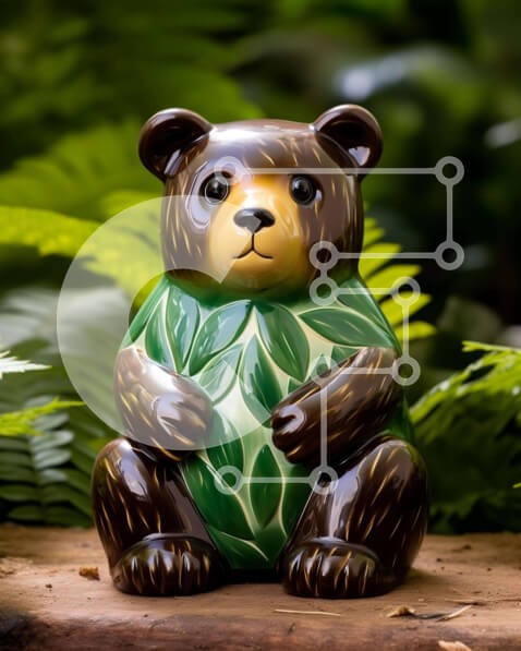 Υπάρχει δυνατότητα προσωποποίησης με δική σας φωτογραφία και προσαρμογής διαστάσεων κατόπιν παραγγελίας. Το συγεκεριμενο puzzle παρουσιαζει Αυτή η εικόνα παρουσιάζει ένα καφέ και πράσινο ειδώλιο αρκούδας τοποθετημένο σε μια άγνωστη ξύλινη επιφάνεια. Το ειδώλιο είναι περίτεχνα διακοσμημένο με φύλλα και αμπέλια, δίνοντάς του μια καλλιτεχνική και φυσική αίσθηση. Στο βάθος, υπάρχουν πολλά πλούσια φυτά, δημιουργώντας έ