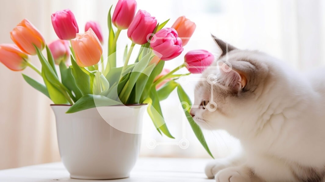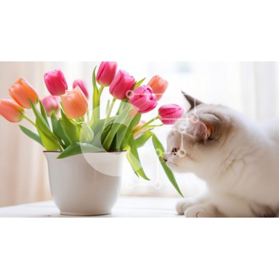 Υπάρχει δυνατότητα προσωποποίησης με δική σας φωτογραφία και προσαρμογής διαστάσεων κατόπιν παραγγελίας. Το συγεκεριμενο Puzzle 10x10 cm – 25 κομμ παρουσιαζει Η εικόνα δείχνει μια λευκή γάτα να κάθεται δίπλα σε μια διάταξη από ροζ τουλίπες. Η γάτα κοιτάζει τα λουλούδια, τα οποία φαίνεται να είναι φρέσκα και σε καλή κατάσταση. Υπάρχουν επίσης μερικά πράσινα φύλλα γύρω από το βάζο, υποδηλώνοντας ότι
