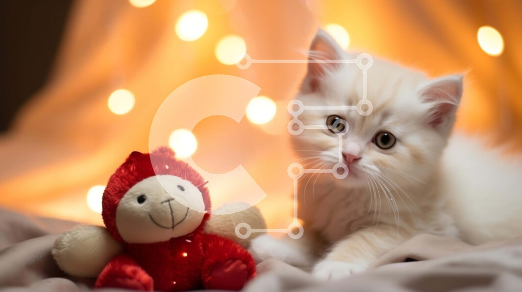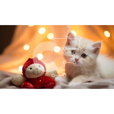 Υπάρχει δυνατότητα προσωποποίησης με δική σας φωτογραφία και προσαρμογής διαστάσεων κατόπιν παραγγελίας. Το συγεκεριμενο Puzzle 10x10 cm – 25 κομμ παρουσιαζει Αυτή η εικόνα παρουσιάζει ένα λευκό γατάκι που κάθεται δίπλα σε ένα λούτρινο παιχνίδι σε σχήμα ζώου. Το γατάκι αναπαύεται άνετα σε μια κουβέρτα διακοσμημένη με πολύχρωμα φωτάκια. Στο βάθος διακρίνεται ένα μικρό κόκκινο αρκουδάκι που υποδηλών
