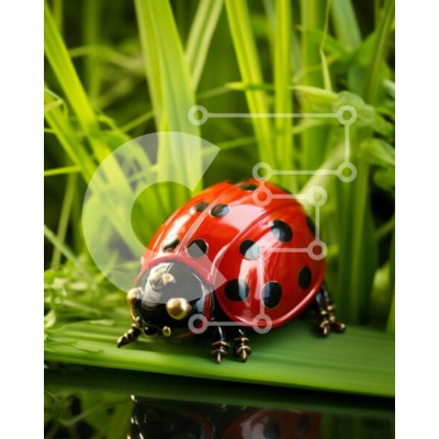 Υπάρχει δυνατότητα προσωποποίησης με δική σας φωτογραφία και προσαρμογής διαστάσεων κατόπιν παραγγελίας. Το συγεκεριμενο puzzle παρουσιαζει Η εικόνα δείχνει ένα ειδώλιο πασχαλίτσας τοποθετημένο πάνω από ζωντανό πράσινο γρασίδι. Το ειδώλιο είναι τοποθετημένο στο κέντρο του πλαισίου με την περίπλοκη λεπτομερή πλάτη του στραμμένη προς τα πάνω. Μικρές μαύρες και κόκκινες κουκκίδες κοσμούν το σώμα της πασχαλίτσας, προσ