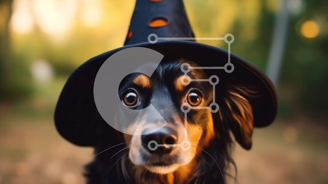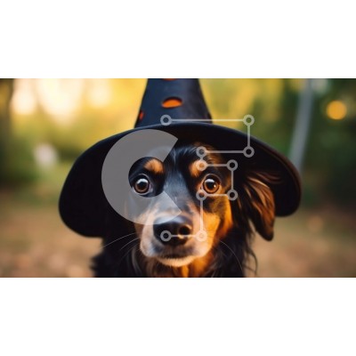Υπάρχει δυνατότητα προσωποποίησης με δική σας φωτογραφία και προσαρμογής διαστάσεων κατόπιν παραγγελίας. Το συγεκεριμενο Puzzle 10x10 cm – 25 κομμ παρουσιαζει Αυτή η εικόνα δείχνει έναν μαύρο και καφέ σκύλο που φοράει ένα παλιομοδίτικο καπέλο μάγισσας. Ο σκύλος κοιτάζει απευθείας την κάμερα, δείχνει περίεργος και ενδιαφέρεται για κάτι ή κάποιον. Μπορεί να είναι ντυμένο για μια εκδήλωση όπως το Hal