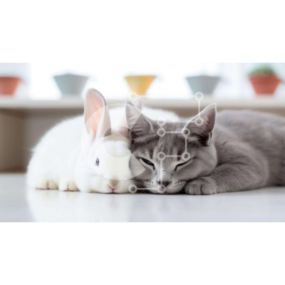 Υπάρχει δυνατότητα προσωποποίησης με δική σας φωτογραφία και προσαρμογής διαστάσεων κατόπιν παραγγελίας. Το συγεκεριμενο Puzzle 10x10 cm – 25 κομμ παρουσιαζει Αυτή η εικόνα απεικονίζει μια γκρίζα γάτα και ένα λευκό κουνέλι να βρίσκονται δίπλα δίπλα στο πάτωμα. Η γκρίζα γάτα ακουμπάει πάνω από το κεφάλι του κουνελιού, ενώ το άσπρο κουνελάκι είναι στριμωγμένο δίπλα του. Πολλά φυτά σε γλάστρες τοποθε