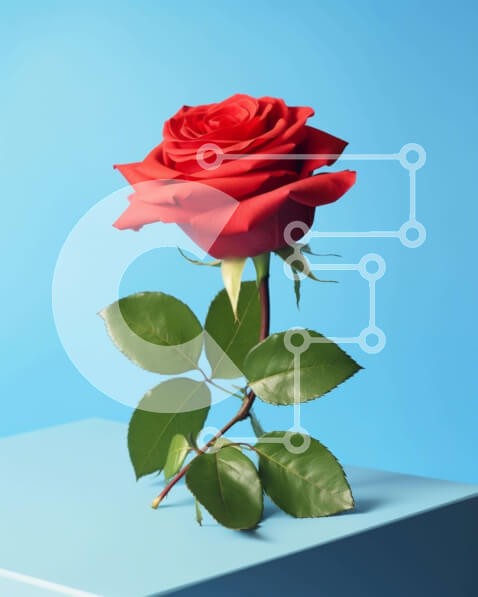 Υπάρχει δυνατότητα προσωποποίησης με δική σας φωτογραφία και προσαρμογής διαστάσεων κατόπιν παραγγελίας. Το συγεκεριμενο puzzle παρουσιαζει Η εικόνα παρουσιάζει ένα ενιαίο κόκκινο τριαντάφυλλο, το οποίο είναι τοποθετημένο πάνω από έναν ανάποδα μπλε κύβο. Φαίνεται να αναπτύσσεται από το κέντρο της πλατείας, υποδηλώνοντας ότι είναι σε άνθιση. Υπάρχουν δύο φύλλα προσκολλημένα στο στέλεχος, παρέχοντας πρόσθετο οπτικό